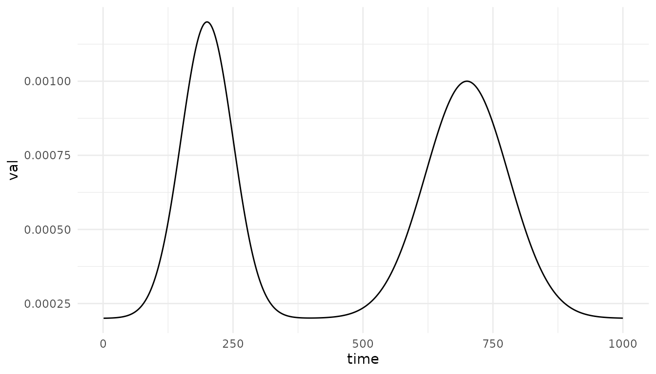 0.0008 * exp(-((t - 700)^2) / (2 * 80^2)) # second hill